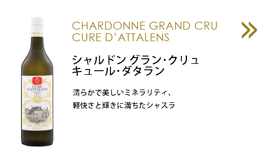 オブリスト社がシャルドンヌ地区に所有する「キュール・ダタラン」は、ヴヴェイの高台にある庭園のような美しい畑。清らかな白い花の香りと、熟したりんご、かりんや白桃の風味が印象的で、熟成すると洋梨やアプリコットの風味があらわれます。