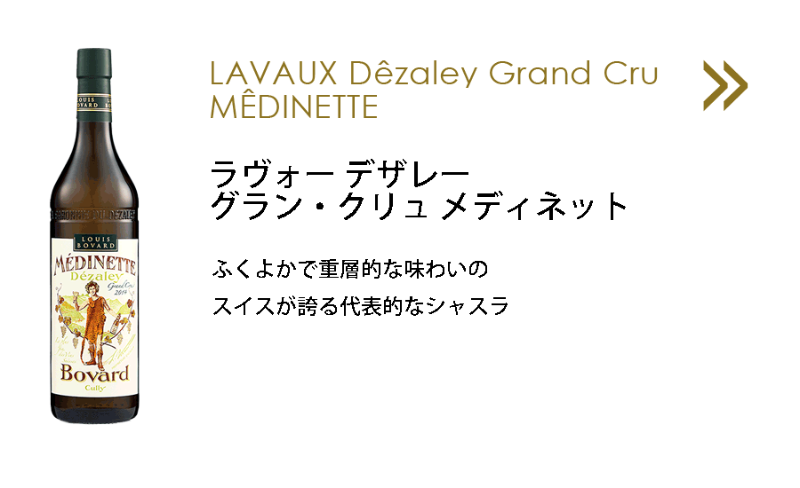スイスが誇るシャスラの最高峰といわれる「メディネット」。葡萄はデザレーの複数の区画のアッサンブラージュで、シュール・リー製法を用いてふくよかで重層的な味わいに仕上げます。