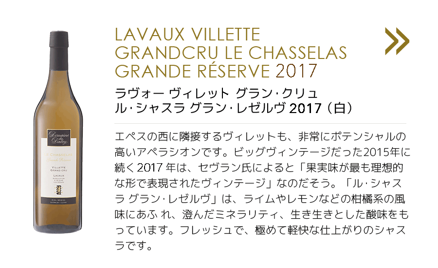 ラヴォー地区西部のグラン・クリュ畑ヴィレッテのシャスラ・グラン・レゼルヴは、完熟した洋梨、白桃と黄桃、ネクタリンの豊かな果実味と澄みきったミネラリティを併せ持ち、サテンのようになめらかな酸味が印象的です。バランスの良いボディ、かすかに白胡椒を感じるフィニッシュ。例年に増して輝きのある味わい。長期熟成を約束するシャスラです。