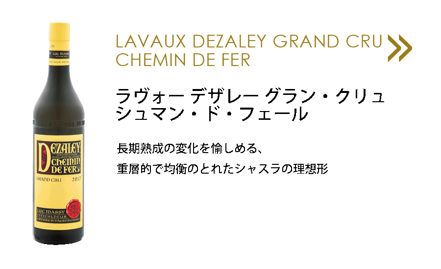 エレガントな花の香り、熟れた白桃と黄桃の風味、デザレーらしいシャープなミネラリティなど幾つもの味わいの層を持ち、余韻も長く均衡のとれた仕上がり。「シュマン・ド・フェール」とは鉄道の意味。長期熟成に向き、味わいの変化を愉しめるシャスラです。