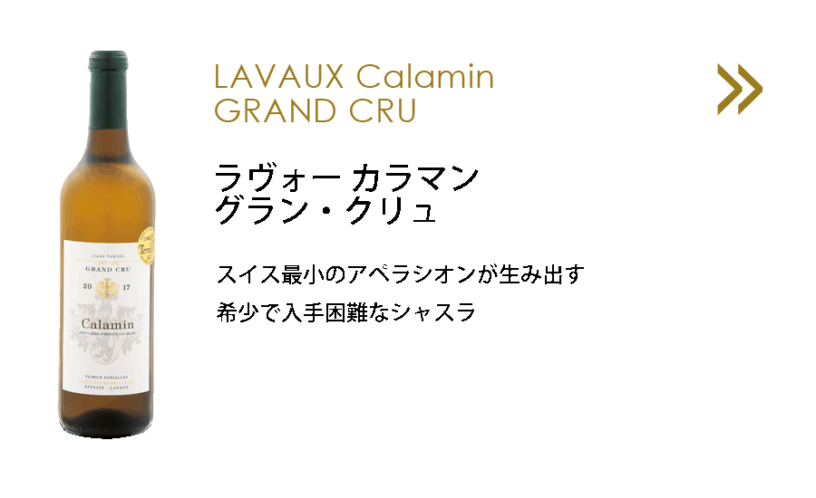 スイス国内最小のアペラシオンとして知られる「カラマン」。面積はデザレーの3分の1程度で、デザレー以上に希少で入手困難なシャスラです。気品あるシトラスの風味、柑橘系のアロマ、りんごの花の優しい香りとみずみずしい白桃やメロンの魅力的な味わい。