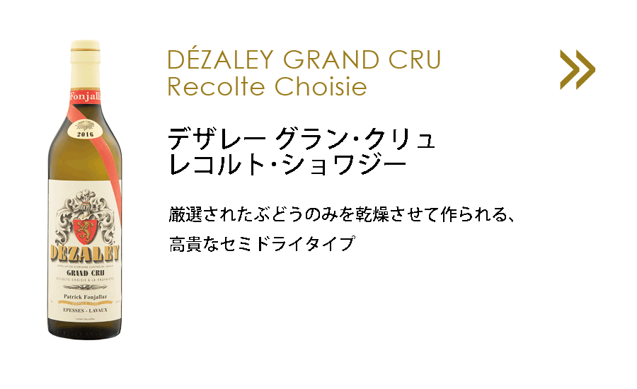 干しぶどうのように乾いたシャスラを圧搾して得た糖度の高い果汁から造られるデザートワイン。モントルー地区の高台で栽培されているシャスラを、収穫後に風通しの良い場所で時間をかけて乾燥させてから仕込みます。